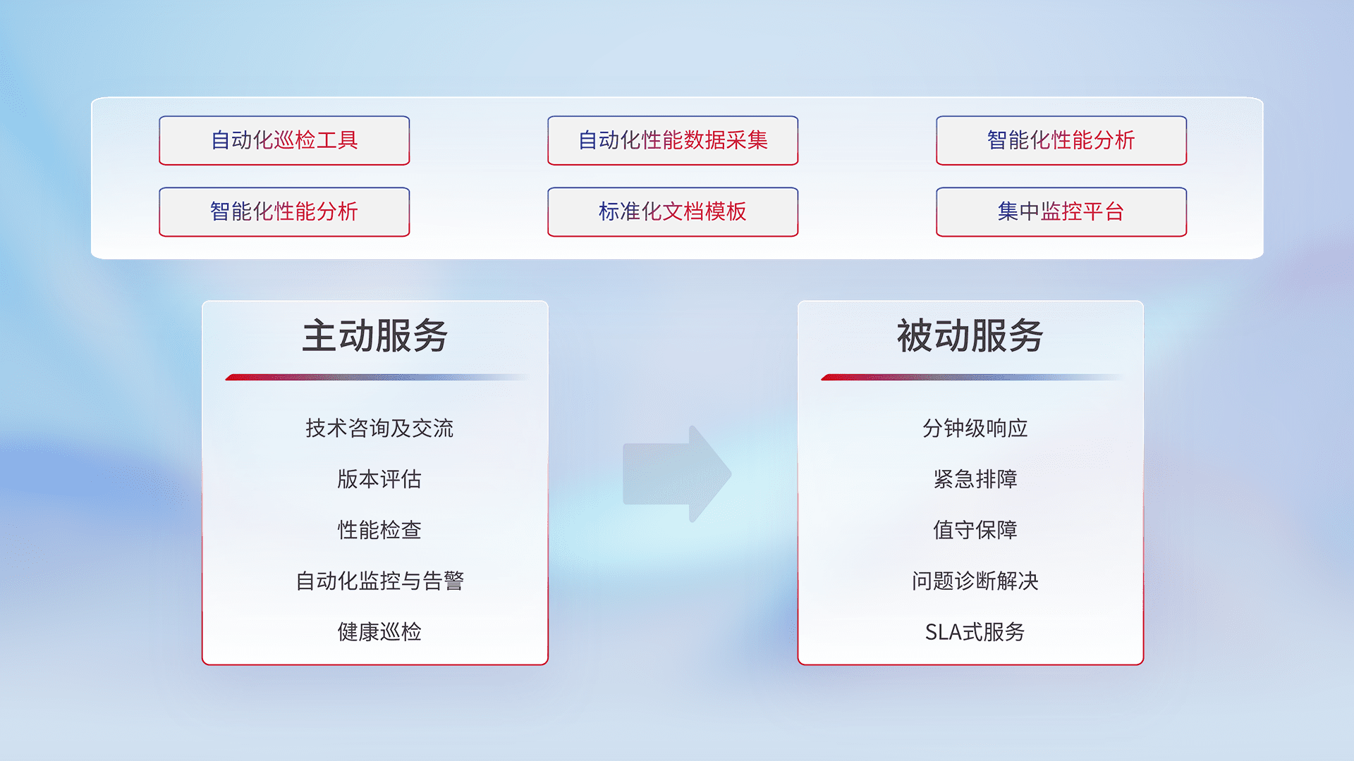 智能化工具和标准化文档,,,保障服务质量,,,提供主动服务(包含技术咨询、、、版本评估、、、、性能检查、、、、自动化监控与告警、、、健康巡检)和被动服务包含(分钟级响应、、紧急排障、、、值守保障、、、、问题诊断解决、、、SLA服务)。。